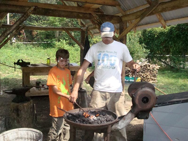 We’re a real camp. No cement here. We live in the woods, with our own lake, pastures, and forest. You’ll get a real sense of “camping out”. We live in summer cabins, we offer a lot of different kinds of activities, and we focus on life in the outdoors. We laugh and learn and play our way through the days. We teach all kinds of interesting things. We offer over fifteen different in-camp activities, in areas like sports, outdoor living skills, arts and crafts. We teach Archery, Horse Riding, Tennis, Mountain Biking, Swimming, Canoeing, Ropes Course, and Kayaking. We have a pioneer-style farm, with a milk cow, chickens, goats, sheep, pigs, ducks, rabbits, and kittens. We make things in Woodshop, Rocketry, Blacksmithing, Weaving, Pottery, Silk-Screening, and Arts & Crafts. We take trips hiking, swimming, backpacking, canoeing, sailing, rock climbing, and caving.